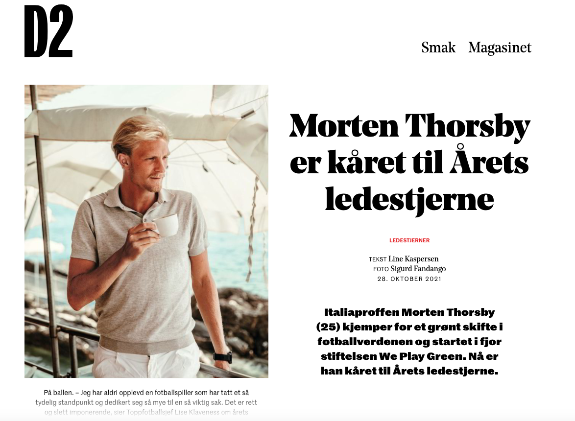 Norway's most environmentally conscious football professional, Morten Thorsby has been nominated in D2's Leading Stars award. Dagens Næringsliv and D2 have voted 30 under 30 which will make the world more sustainable through ideas, action or leadership qualities.